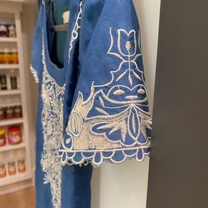 Indigo Blue MM Couture Embroidered Dress with flattering tie in back, size medium. 70% cotton, 30% silk, fully lined.