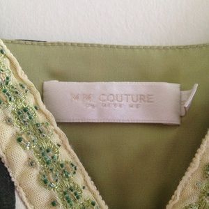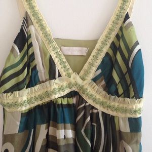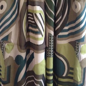 Geometric print dress with ribbon and beaded detail. Overlay is sheer chiffon-like with a green lining. A unique and fun dress. Only worn twice.