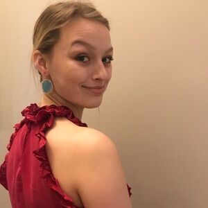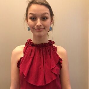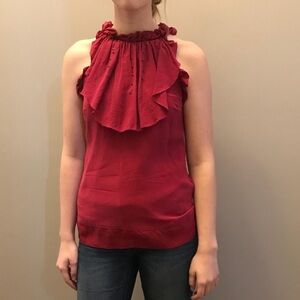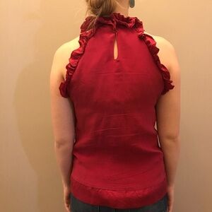 Lovely top with such a pretty hot pink magenta color. 100% silk. Dry clean only. Size Small. Excellent condition. There is a top hook missing in the back of neck. Very unnoticeable but can easily be replaced inexpensively. Look like a million bucks every time you wear this! Love the pretty details such as ruffles below neckline with light beading and satin trim around bottom of shirt. Side zipper. Absolutely darling!