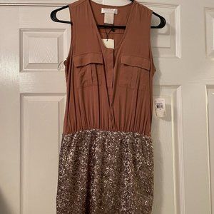 Beautiful brown cocktail dress with 2 pockets on chest and gold sequin bottom, size XS. Brand new with tags! Never worn!
