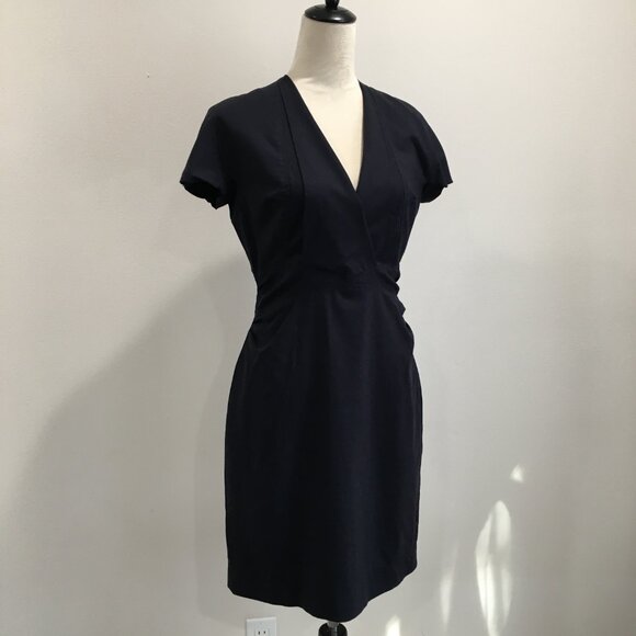 MM LAFLEUR Dark Blue Italian Wool Blend V Neck Short Sleeve Sheath/Shift Dress