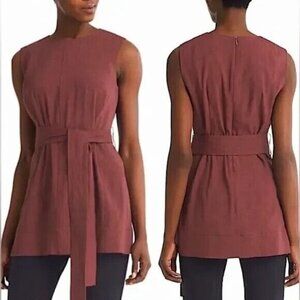 This polished top features a sleek tie at the waist and sculptural seams through the chest. Crafted from a stretch linen from Italy, the Angelina has a classic crew neckline and elongated length for additional coverage.