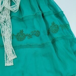 Beautiful peasant style top from Miss Me or MM Couture. This top is lined, soft, and so lovely. Three button style with pom pom trim around flutter sleeves and bottom hem, embroidered floral detail and tie waist. Size S and excellent condition.