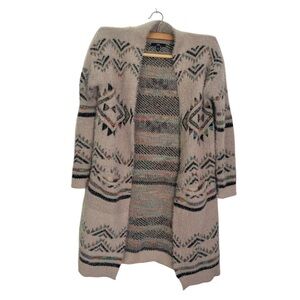 Stylish cardigan with geometric patterns. Knee length. Features a mix of colors including cream, black, and green. MM My Michelle. Size Small. Soft, gently used.
