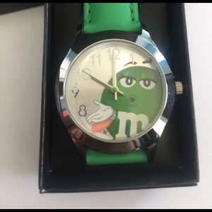 This is a brand-new Quartz M&M watch in the color green it will fit Small/medium wrists. This watch is brand-new in the box without tags. This is an analog watch it has a manual dial to adjust the time. The watch provides accuracy to the seconds per month