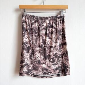 Details: MM6 Maison Martin Margiela fitted mini skirt with elastic waistband. Super soft fabric with a bold pink and gray conceptual print, resembling abstract sepia camouflage or stylized Christmas trees. Made in Italy. Distinctive eclectic piece with a punk, grunge, and maximalist edge, reflecting Margiela’s avant garde aesthetic. Perfect for contemporary, editorial, or streetwear styling.