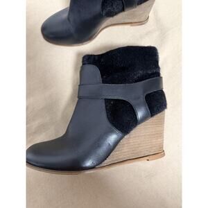 Style: Womens wedge ankle boots with black smooth leather uppers and furry haircalf-style shaft.