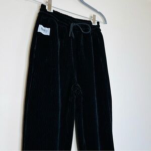 Joggers style. Comfy but straight, slim silhouette. Cropped profile. Elastic waist. Elastic leg openings. Inseam side pockets. Brand label sewn near upper right pocket. Midweight fabric with a bit of "give" but no real stretch. Soft cotton, corduroy texture (on the thicker side) and velour-like feel. Made in Italy.