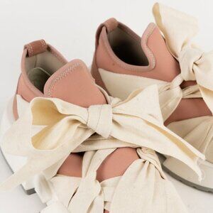 Dusty rose neoprene MM6 Maison Margiela slip-on sneakers with herringbone cotton ribbon bow accents at uppers, suede panels at counters and chunky white and grey rubber soles.