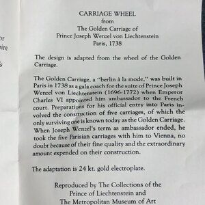 Vintage 1985 MMA Carriage Wheel brooch METROPOLITAN MUSEUM OF ART pin/Brooch 24K Gold Electroplated Rare. The golden carriage of Prince Joseph Wenzel Von Liechtenstein Paris 1738. Please see pictures for more detail.