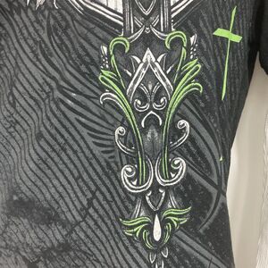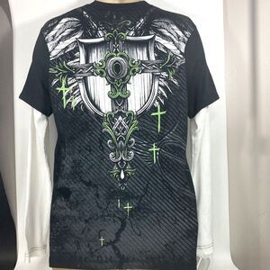 MMA Elite-Sz M-Y2K Affliction Styl-Graphic GothicCeltic Cross-Thermal-Gray/Green