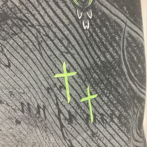It is black with white sleeves, a front and back gothic-style, Celtic-like cross in green, black and white, with a shield and wings behind it. There also a few small, simple, green crosses over the whole print. Men's size Medium! Please see measurements below for exact fit.