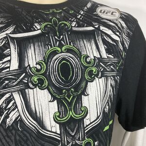 This shirt is new without tags! It does still have the UFC Official Partner sticker on the shoulder. Despite this, there is one flaw: a small, subtle dark stain on one of the white sleeves.