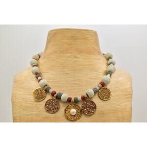 MMA Vintage Coin Collar Necklace Stone Brushed Gold Coin Tribal Signed BinBN