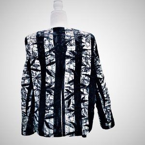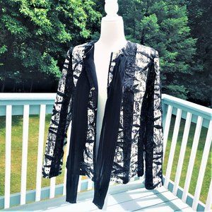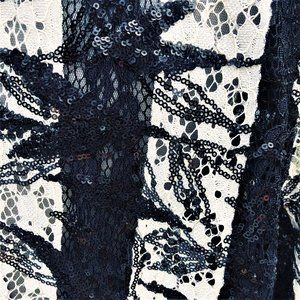 M. MIRANDA Retro style gorgeous striped black and white lace adorned with small black sequins and black tulle lining. Pleated black necktie, hook and eye front closure, long sleeves and soft padding. Polyester, hand wash cold. Very good condition. Pit to pit 23 inch, Length 24 inch US Size 18 Made in Turkey.