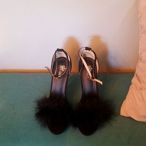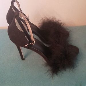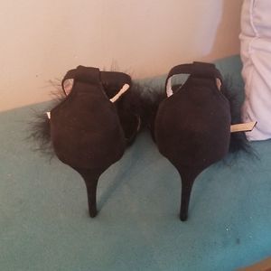 MMJULY Black Faux Suede Open Toe Feathered Heels NWOT Sz. 8.5M & 10M