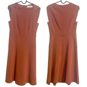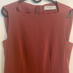 Features: sleeveless, square neckline, flare skirt, A line silhouette, hidden back zipper, unlined, in brick red