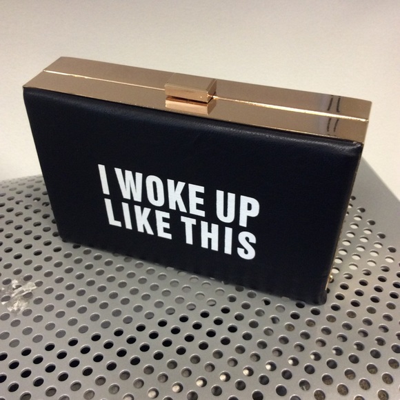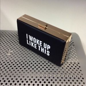Black clutch. Has a chain strap, and a card slot inside.
