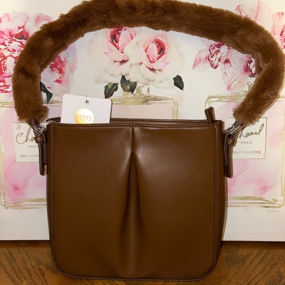 Chic tan shoulder bag with a soft faux fur handle. Ideal for a stylish look.