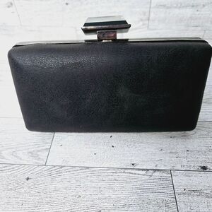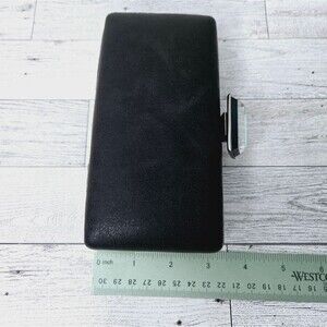 Very Good PreOwned Condition - MMS Design Studio hard side clam shell clutch evening/special occasion bag. Black leather like material outside, velvety material inside and silver clasp & hardware.