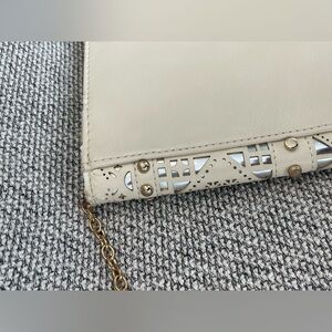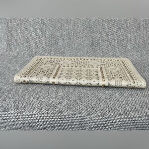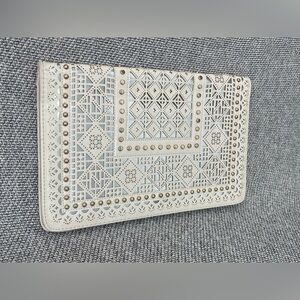 This elegant white clutch from MMS Design Studio features a stunning array of geometric cutouts, creating a lace-like effect. Crafted from a leather-like material, its textured surface adds a touch of sophistication to any ensemble. Perfect for special occasions, this clutch is both stylish and versatile.