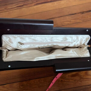 This unique, gently used MMS Design Studios woven fabric clutch is the perfect size for a night out. The exterior is made of neutral colored woven fabric in cream, tan, and black, while the interior features a silky pocket. The wooden style handle adds a touch of sophistication.