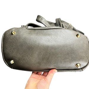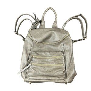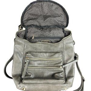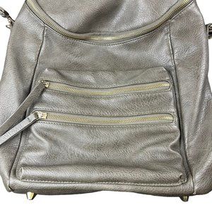 For sale: Stylish vegan leather backpack / bag. A shade of gray with gold hardware. Large interior and lots of pockets.