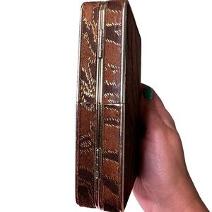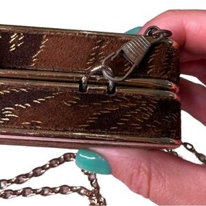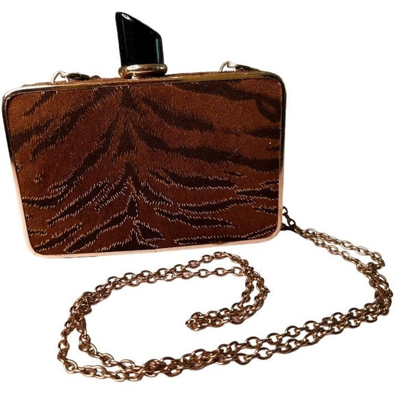 Brown velvet animal print clutch with metallic accents and gold hardware, featuring a long chain. The chain can be removed or tucked inside the purse.