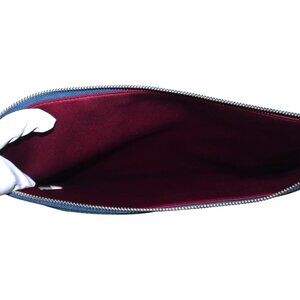 This Marc by Marc Jacobs flat zip clutch features bold yellow and sky-blue horizontal stripes in a coated leather-like finish with a navy logo plaque, lined in rich burgundy fabric for a luxe pop of contrast. Slim yet roomy enough for phone, keys, and cards, it works as a statement clutch, travel pouch, or tablet sleeve for coastal grandma, resort, and preppy chic aesthetics.