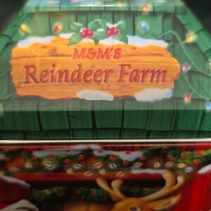 M&Ms Brand Christmas Village Series reindeer farm #16 Limited Edition candy canister tin 2003. Yellow and Green M&M Are attempting to put a red Nose on a reindeer, Green M&M Is petting a reindeer Orange M&M Is startled when he sees the shadow of Santa, Blue M&M Is relaxing on a sleigh of toys with an owl overhead. There is a cat playing with the Christmas Lights on top of the roof. 4 inches wide. 7 inches tall. Excellent condition.