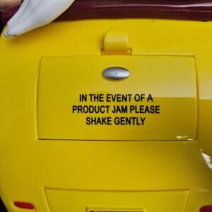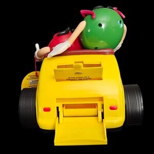 Fun and collectible M&M’s Hot Rod candy dispenser featuring Red and Green M&M characters cruising in a bright yellow car with red flame decals and chrome engine details. The rear hatch opens to dispense M&M candies (or similar-sized treats).