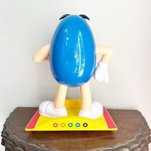 Fun and collectible M&M’s Blue character candy Display. Features the iconic blue M&M figure with playful pose, standing on a yellow base with colorful M&M accents. Measures approximately 14” tall x 8” wide.