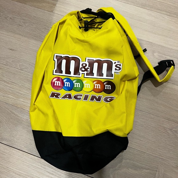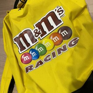 Bright yellow M&M's Racing drawstring backpack. Features colorful M&M's logo.