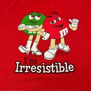 Red short sleeve tee with the green and red M&M characters and ‘Irresistible’ printed on the chest.