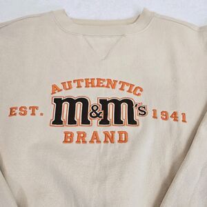 M&M's World Sweatshirt Womens Small Tan Authentic Brand Embroidered Logo Pullover Crewneck 1941 Logo