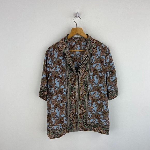 MNG Abstract Pattern Print Light Shirt, no stretch, great look, breezy Features: • Color: blue Size: Womens 8 Measurements: Pit to pit: 23 in / 58 cm Waist: 22 in / 56 cm Length (Shoulder to hem): 26 in / 66 cm Sleeve length: 13 in / 33 cm Condition: Pre-Owned Like New SKU: E909
