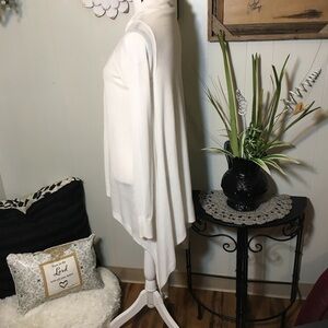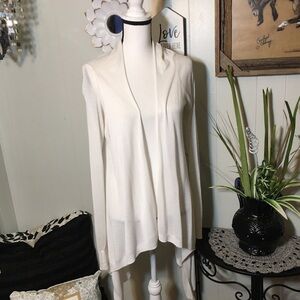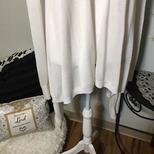Lite weight knit long sleeve straight back hem with v side hem. Gently preowned condition. There is no material tag. Feels like acrylic knit.
