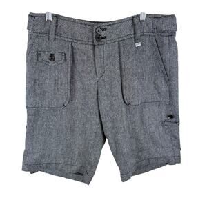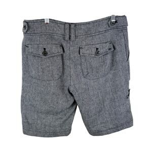 Excellent preowned condition. Black/cream chevron patterned Bermuda length tweed shorts. Roll tab hem (pictured). Double button/zipper closure. Open pockets on front/button flap pockets on back/small button flap pocket on right front. Polyester/acrylic/wool/viscose/polyamide material. Approx. measurements: Waist 34", inseam 12", rise 9.5". Size 10.