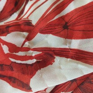 Stylish red and white floral dress with a relaxed fit. Perfect for casual outings. Adjustable tie waist. Sheer sleeves. Layered skirt. Lined