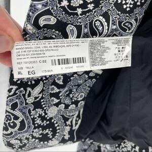 Excellent condition, pre-owned MNG Collection Paisley Navy White Print Blazer in Size 10. One button blazer. This is so cute! Perfect to dress up or down. Very thin shoulder pads inside blazer. Please see all pics and measurements below.