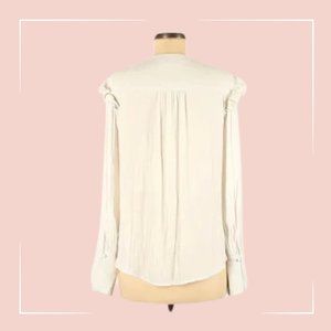 Gorgeous ruffled long sleeve blouse by MNG. Cream/off-white color, ruffled details on the shoulders, delicate buttons down the front. Bought originally on Thred Up, but really haven't found many occasions to wear it. Measurements are from TU.