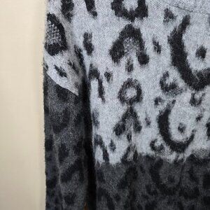 Medium knit. Straight Design. Leopard design. Animal print. Round neck. Long sleeve. No fastening. Gradient effect where the top portion has a lighter grey base with black spots, transitioning to a darker grey/black at the bottom. Slight sheen to the knit. Soft texture. Provides comfort and freedom of movement