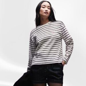 MNG Mango Classic Striped Long Sleeve Tee Small Cream Burgundy Nautical Chic EUC