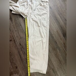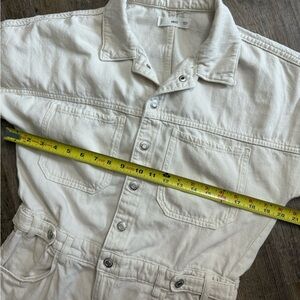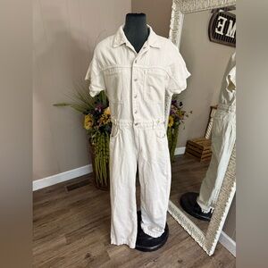 In excellent condition. Very light wear. No flaws. Size large. Off white. Multi position buttons at the waist. Full length. Short sleeve. Button and zipper fly on the pants and snap button closure on the top.