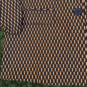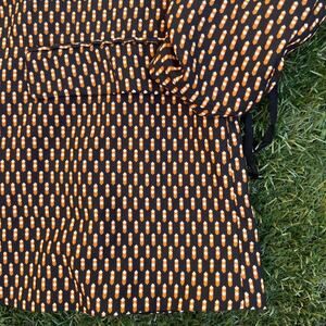 This beautiful and unique suit blazer is perfect for work, special occasions or casual wear. It’s a feminine play on menswear, with a flowy long fit, and scrunched quarter sleeve detail. The rusty orange brown with cream pattern gives this blazer a mid-century vintage vibe, while maintaining a modern fit and style. Super versatile, can easily be worn with denim jeans and a black tee for a casual brunch outfit. Or pair it with a Bodycon black dress for a formal layer to a wedding or business meeting.