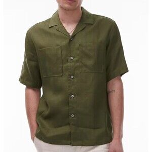 MNG Mango Olive Green 100% Linen Short Sleeve Button-Up Camp Shirt Size L