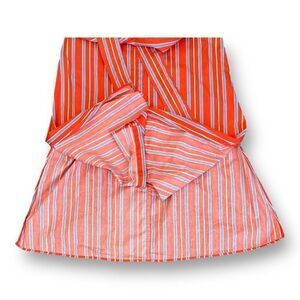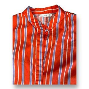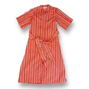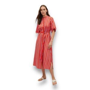 Elevate your everyday style with this vibrant Mango shirt dress, perfect for casual outings. The striking red hue and playful striped pattern make it a standout piece in any wardrobe. Designed with a classic collar and a button-down front, this midi dress offers both comfort and sophistication. The short sleeves keep it breezy, while the matching fabric belt cinches at the waist for a flattering silhouette. Crafted from lightweight, breathable cotton, it promises ease on warm days. Plus, it's machine washable for effortless upkeep. This pre-owned gem is ready to add a splash of color and charm to your collection.