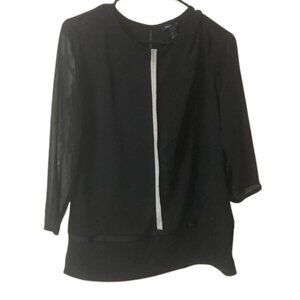 MNG Mango black sheer top with white contrast detail going down the front center. Sheer sleeves and sheer bottom trim. Back has a neck button closure. EUC no callouts.