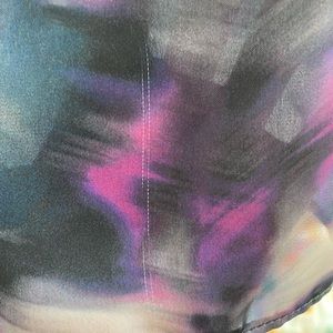 Beautifully colored shell by MNG Mango. Features scoop front and v back. Very lightweight. Only worn a couple of times but while photographing it I noticed some white lines in the material. I’m not sure if this is un-dyed portions of thread or if it has been snagged. I really had to really look it over to find them. Price reflects this.
