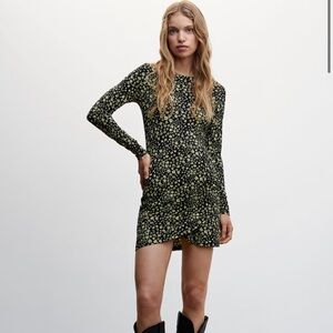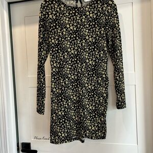 Chic black dress with yellow floral pattern. Long sleeves. Perfect for casual outings.